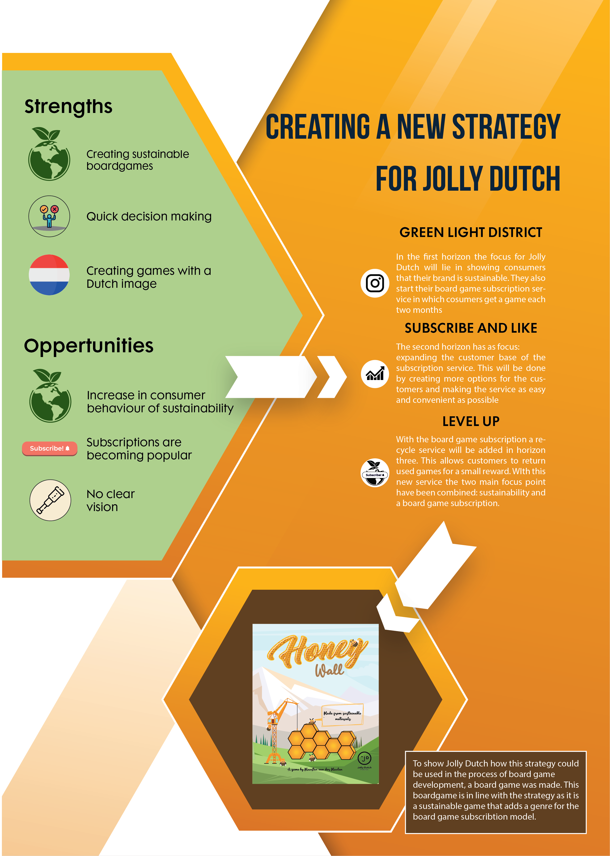 To find the answer to the research question “How can one create a future proof strategy for Jolly Dutch?” different methods were used. First of all, market research was done through multiple interviews with experts of the board game industry, a questionnaire on a board game forum and desk research. With the market research information, search areas were found and eventually converted to a new strategy. As a final step, this strategy was explored through the use of an online interview with potential customers. This resulted in a new strategy for Jolly Dutch and a board game that fits this strategy.