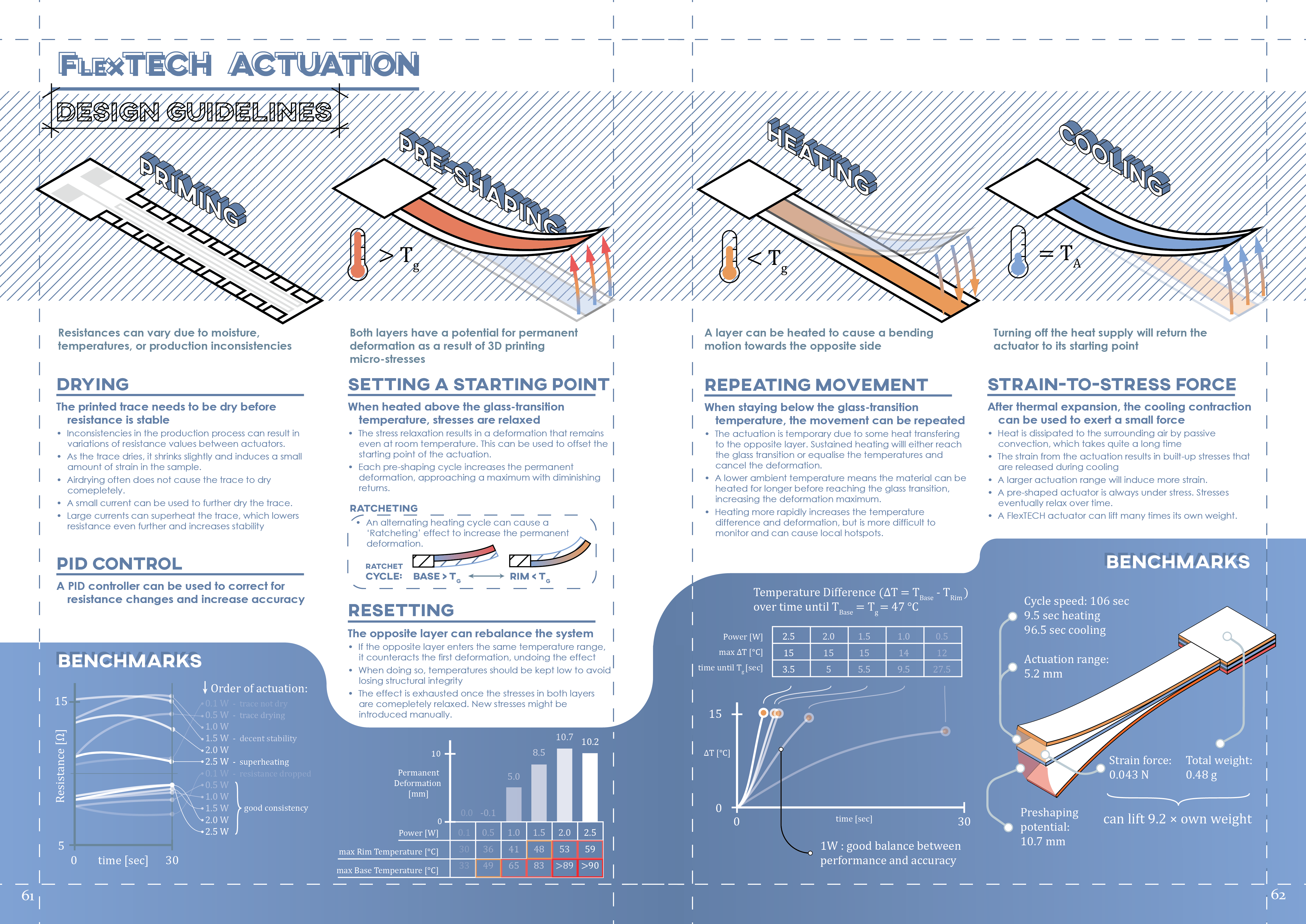 By combining the recent innovations of 4D Printing and Printed Electronics, the Emerging Materials group at the Delft University of Technology has developed a new, printable, self-actuatable material that can continuously change shape in a programmable manner. A specifically designed strip of conductive and non-conductive materials exhibits flexion when exposed to an electric current, which can be used to control the actuation. The resulting actuator is small, lightweight, and can be printed as a single component. Several potential features of this phenomenon are explored, and its performance is quantified through a series of scientific experiments. The tools and knowledge obtained are presented in a series of comprehensive Design Guidelines and demonstrated by a locomoting robot. The project redefines the material’s properties under the new name “FlexTECH” and makes the technology more accessible to encourage designers in fields such as Aerospace and Soft Robotics to use FlexTECH actuators to solve future design challenges