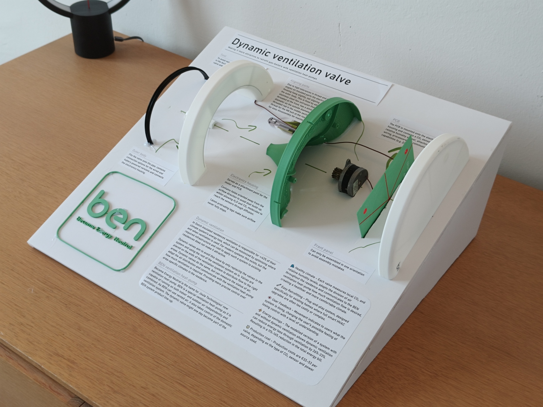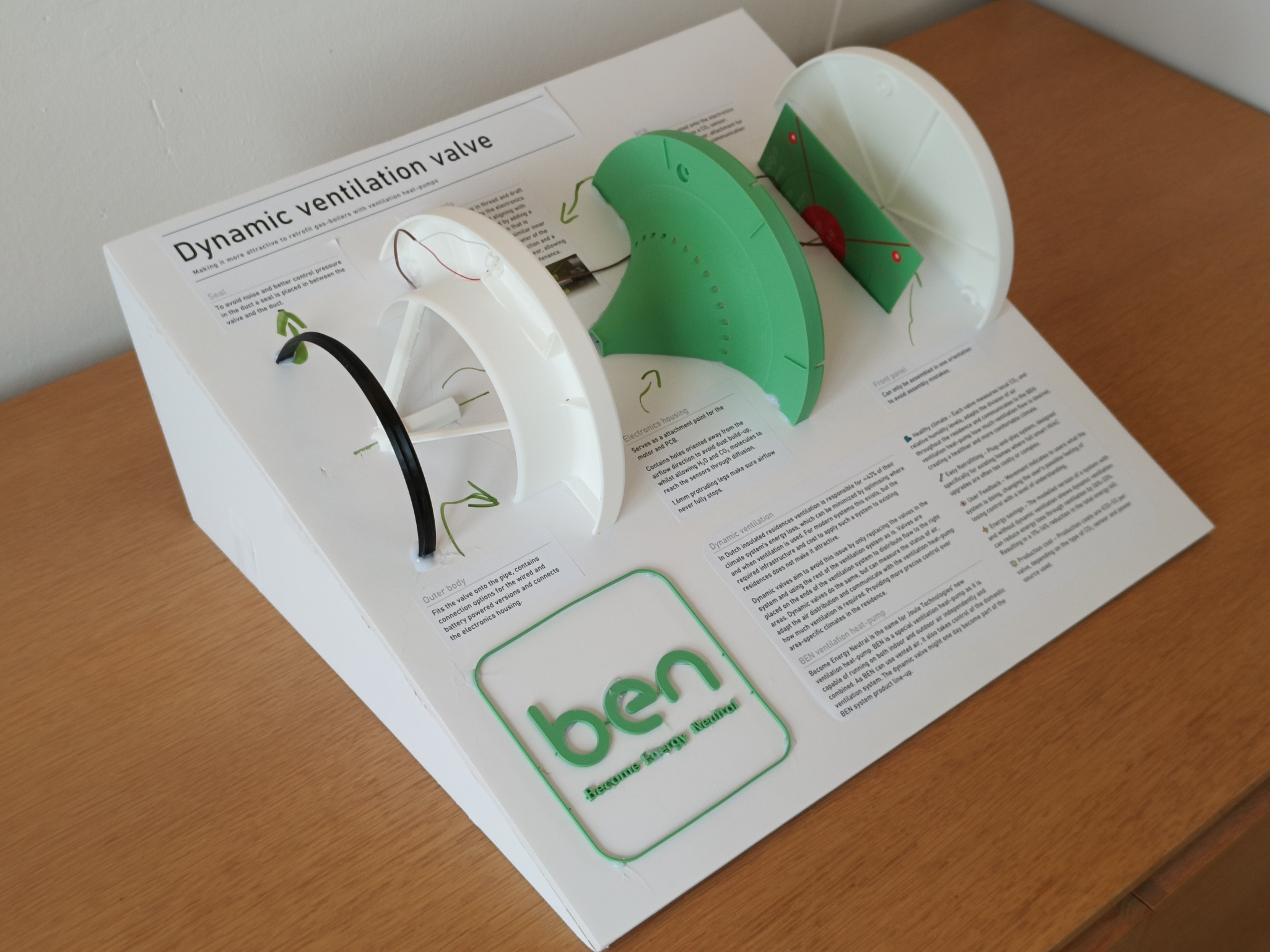 This process provided a prototype for the dynamic valve. Valves are placed on the ends of the ventilation system to distribute flow to the right areas. Dynamic valves do the same, but can measure the status of air, adapt the air distribution and communicate with the ventilation heat-pump how much ventilation is required. Providing more precise control over area-specific climates in the residence.