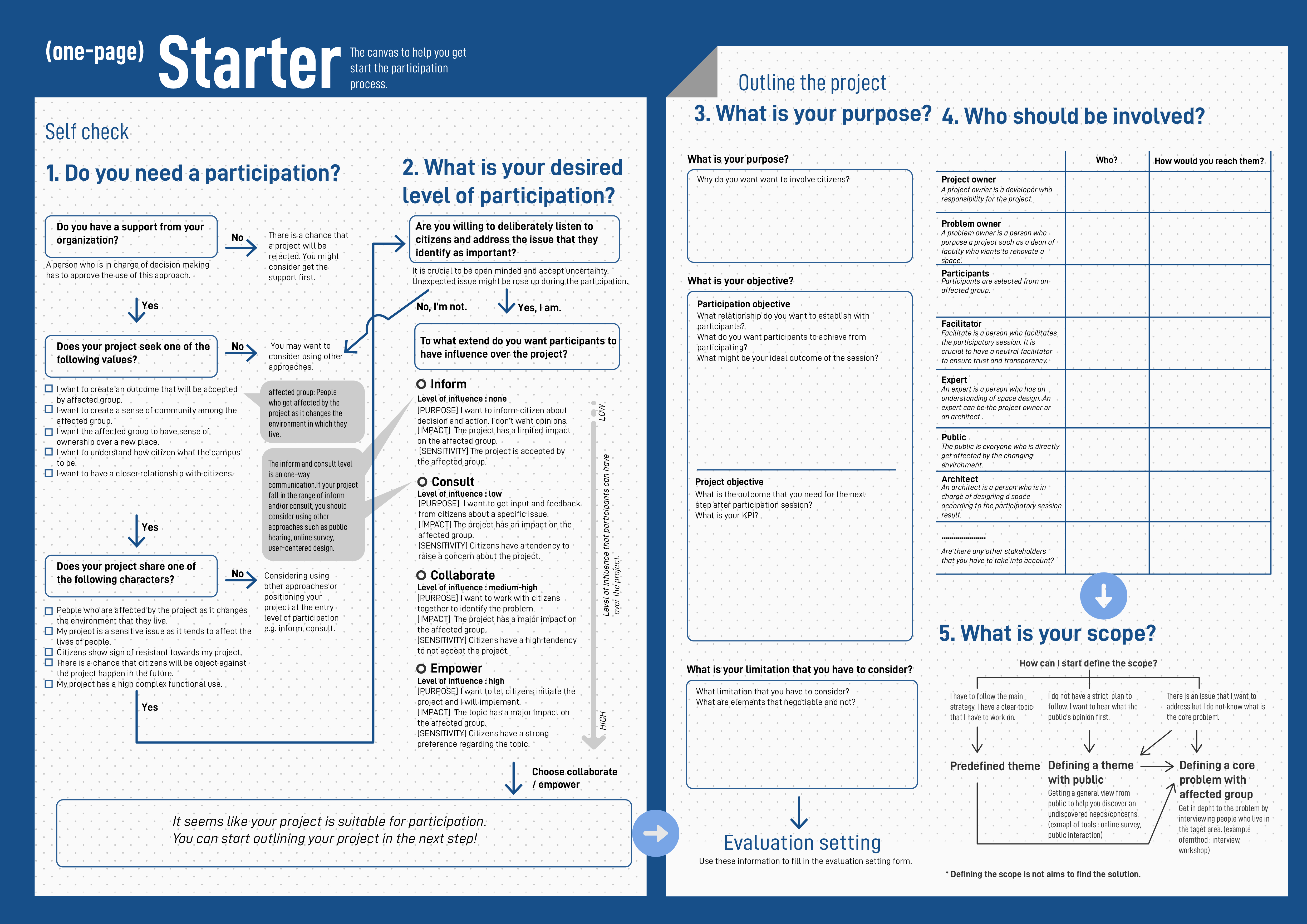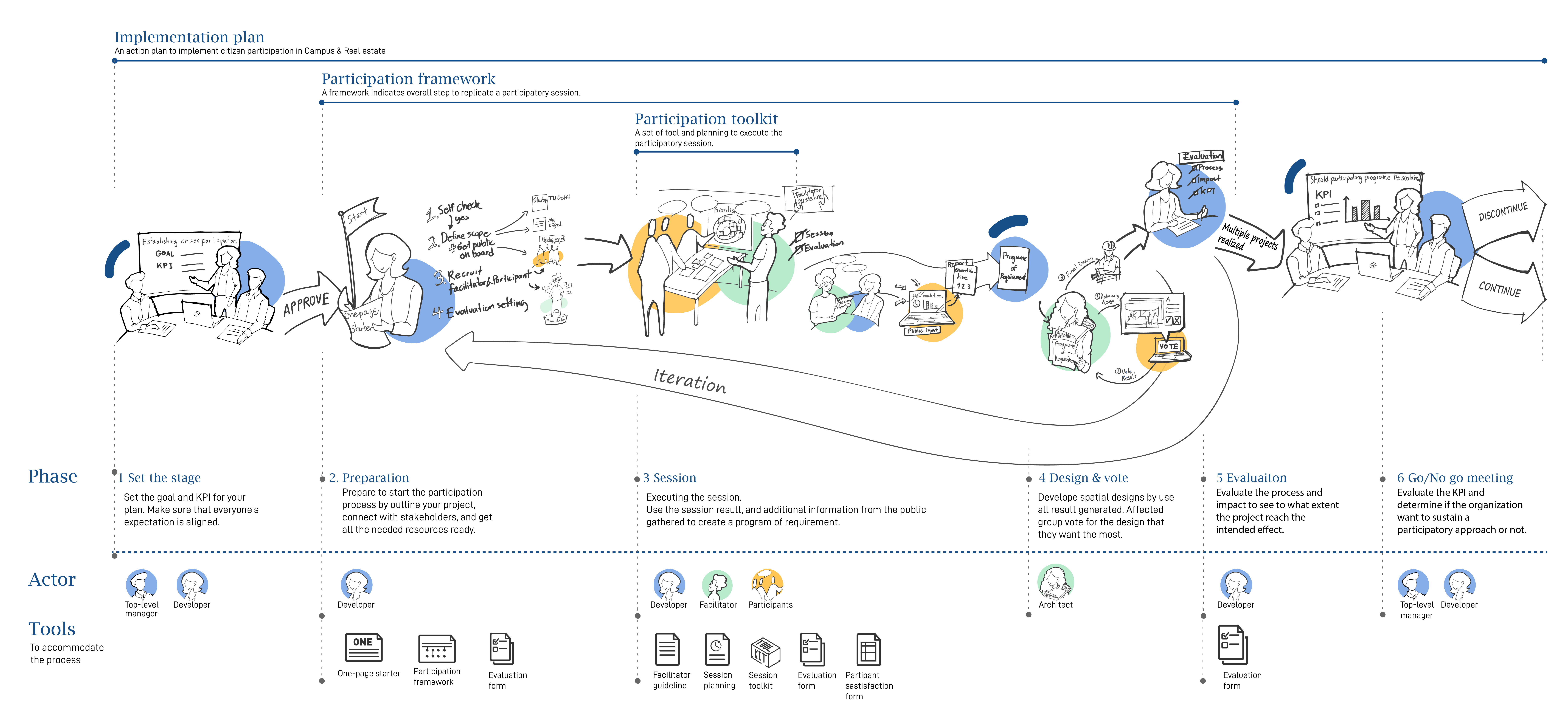 Universities in the Netherlands are challenged by the changing campus development landscape, as the number of students is outpacing the public funding and the role of universities is shifting towards a city. Universities could function as a city, or even become the city (Heijer and Magdaniel, 2012). The changing role of campuses challenges Delft University of Technology(TUD) to function as a city, governing and addressing its citizens in the same way as the city does. The recent trend in public development is citizen participation. The central government of the Netherlands promotes a collaborative way of working between citizens and local authorities. Several participation related projects have been presented, such as Omegevingswet, Delfts Doen!. Corresponding to the need for a collaborative process in public development, TUD has to ensure to involve its citizens, students, and employees in the campus development. However, to involve citizens in the campus development process is not straightforward. This study aims to design a comprehensive implementation plan for the Campus & Real Estate (CRE) division of Delft University of Technology (TUD) to promote citizen participation in campus development. The initial research question was formulated: ‘How to involve the citizens of TUD in the campus development process?’. In this context, citizens mean people who work, study, and live on campus. The main methodologies applied are literature review, interview, and research through design. The research result shows that participatory design (PD) is relatively new to real estate domain. Several challenges of implementing PD were discovered. The TUD campus development process has limited citizen involvement, as it uses a conventional real estate management approach. The prominent challenge is the misconception about the concept of users, as well as the difficulty envisioning the value that PD can bring.Therefore, the demonstration of participatory design conducted aims to deliver two values; to get CRE closer to citizens and foresee the value of PD through experimental cases with CRE. The experiment cases brought CRE closer to users and showed how citizen participation could help CRE create a a program of requirements in a relatively short time. The functional program that meets the needs and concerns of citizens can eliminate the chance to invest in the irreverent, undesirable spatial solution. The comprehensive participation plan was developed to foster the implementation of citizen participation in CRE over a long timeframe. The ultimate goal of the plan is to gradually establish citizen participation in CRE. The plan consists of an implementation plan, participation framework, and participation toolkits. They provide a practical suggestion and guidelines to systematically follow. On the basic level, it is recommended that CRE use the plan to start implementing citizen participation. Further research and experiments are needed to complete a detailed plan in of every steps. It is advisable for CRE to follow the implementation plan and execute a couple of cases to determine if the PD is a suitable approach for the organization, if the value is worth the investment, and if the organization should sustain the PD in the future.