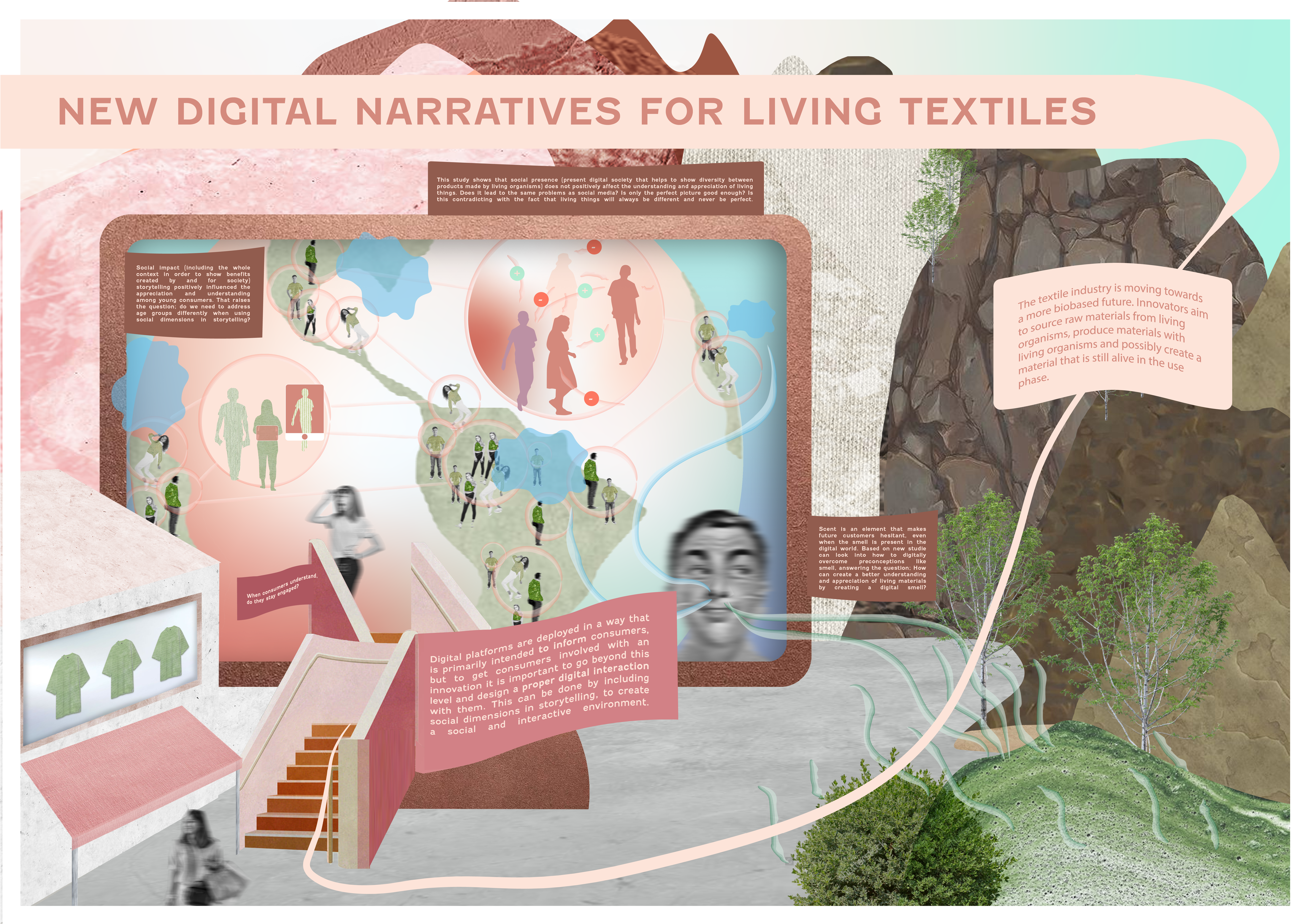 Today, the foundation of the textile industry is built upon the possibility to purchase synthetic fibres as these allow people to have an extensive amount of choices. Unfortunately, they are as far away from nature as it can get. Over the last decade, the industry is increasingly trying to move towards a more bio-based future, often this can be seen in the increased demand for materials sourced from renewable resources such as plants (living organisms) fabrics like cotton. Alongsides the increase in traditional fabrics multiple new initiatives are popping up to connect the textile industry with nature. Due to these endless possibilities, future consumers find it hard to see the wood for the trees. Navigation into the world of biodesign is a necessity to set the next step towards this envisioned sustainable future. What if I told you, to think beyond sourcing materials from living organisms? What if we let living organisms become part of our daily life again? Bioassembly makes it possible to source raw materials from living organisms, produced with living organisms to create a material that is still alive in the use phase. This concept changes the relationship between the consumer and the material. To create comfort around this new relationship innovators should be more interactive with future consumers' so preconceptions can be addressed. Currently digital platforms are the most efficient way of communication between the consumer and the innovator, especially since the shift towards digital channels particularly increased the past year due to social distancing measures as a consequence of Covid-19. However traditional tools are still inadequate in capturing and communicating the qualities of these living materials (D’Olivo & Karana, 2021). Clear digital communication should be transparent and interactive. Besides, it should give a clear image of the aesthetics that currently go beyond beauty and include morals. Morals encourage change on a societal level, where the individual is part of something bigger. The appreciation, attention and understanding of new innovations is built upon social situations and group associations, which are also digitally visible since the rise of social media. So we can state that digital social influence matters since it affects what we think and do. What if we could thoughtfully use social dimensions for the communications of new innovations like ‘living’ textiles? Social dimensions can be split into different levels. Firstly the macro-level of society is envisioned as a concept which is called social impact storytelling. It envisions a clear image on what we could create together in order to provoke change worldwide. Secondly social presence can be used to create a space where people feel safe and free to share and cherish information with others. To finally be influenced by each other; you can pioneer, you can follow or you can do the complete opposite. A qualitative study researches how these particular social dimensions can contribute to the level of understanding and appreciation regarding living textiles. Taking into account the data of 160 participants it should be noted that social dimensions should be used carefully. Innovators should be very specific in what they exactly want to communicate. Social presence can lead to a less professional story since the innovator is not the only source of information anymore. Furthermore innovators should clearly decide to whom they communicate since different groups could be addressed differently. For social impact storytelling this mainly applies when distinguishing between different age groups as there is a lot of difference in what kind of relationship they have with the digital world. The digital world can be a notably broad playground for communication. Let’s design a place that stimulates creativity by giving shape to a material and its ‘livingness’. A world where preconceptions around health, smell and hygienics can be addressed. A world where we can try something new, together.