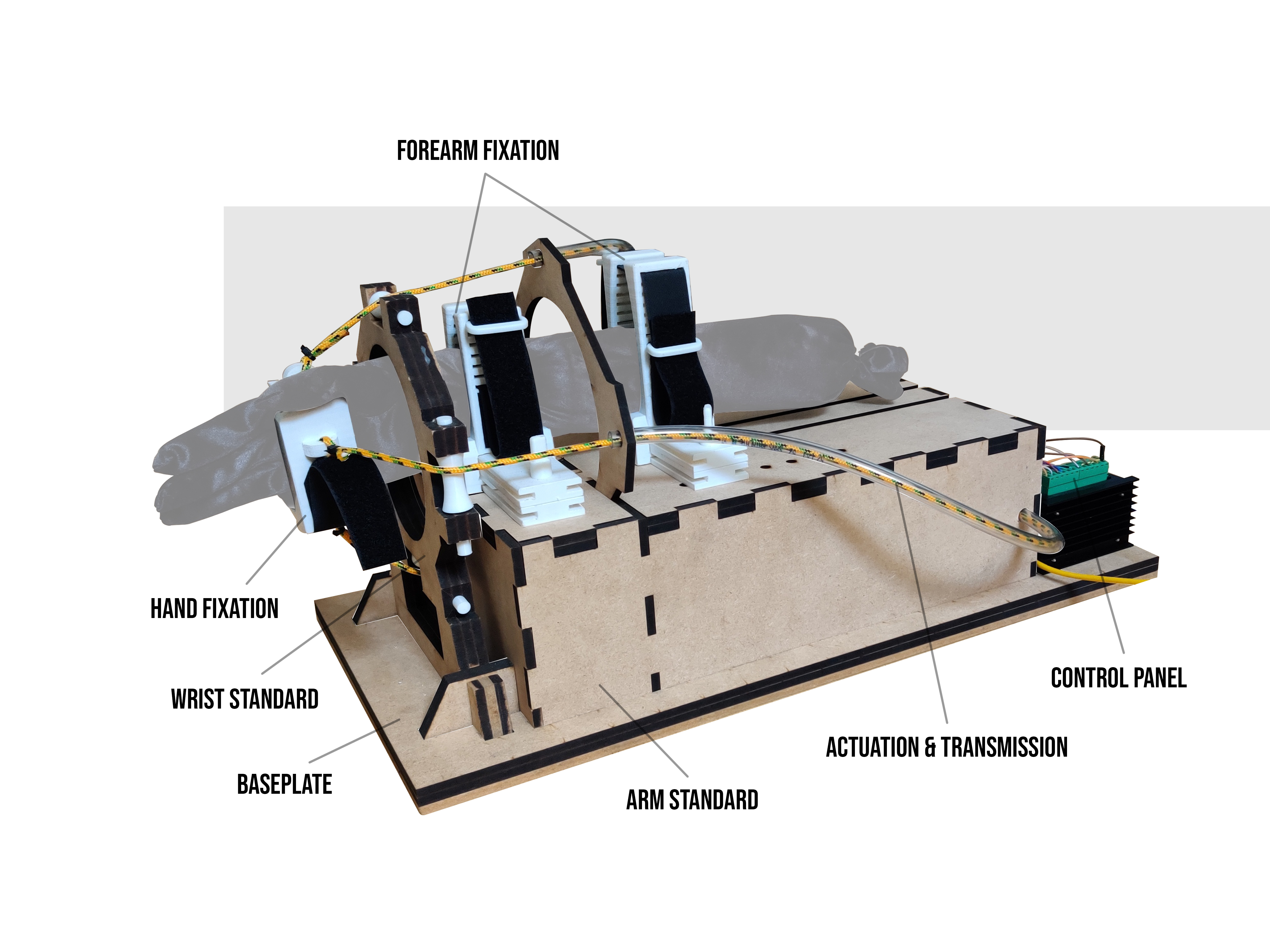 This project is initiated by Stan Buckens, a radiologist from the RadboudUMC, who believes in realizing passive four-dimensional (4D) CT scans for the wrist. At this moment the wrist is mainly scanned and reviewed statically in 3D. However, it is desirable to see what happens on a CT scan during movement (the fourth dimension) of the wrist, as many clinically significant, debilitating and painful wrist pathologies are dynamic in nature and cannot be fully appreciated statically. Recently it has become technically feasible to have patients actively move their wrists in specific directions (e.g. flexion/extension or ulnar-/radial deviation) to create the fourth dimension, so that the wrist can be reviewed dynamically. However, according to S. Buckens (2019) active movements of the wrist are less desirable than passive movement as patients are typically able to (partly) compensate for wrist instability using forearm muscles, masking potentially significant pathology. During this project a suitable solution is designed to passively move the patient’s wrist in a precise and safe way in the gantry during scanning. Within the analysis phase, a context analysis and state of the art research resulted in six focus areas. Subsequently, in the research phase these focus areas were used to obtain optimal understanding of the product’s solution space and to create and evaluate possible solutions for the design problem. For the focus areas market- and literature research was conducted, various experts were consulted and prototypes were developed and tested. Based on the outcomes of all focus areas a set of design decisions was made throughout the project, eventually leading to the final design of the product. The product makes use of a cable-pulley system in combination with stepper motors which facilitate the desired passive wrist movements. Patients are able to place their arm on top of a standard, where special 3D printed parts (with an integrated adjustment mechanism) are able to fixate their forearm. Additionally, velcro straps are used to account for the variation in arm size. Furthermore, the patient’s hand can be fixated by another 3D printed part; again a velcro strap is used to improve fit and fixation. Electronic parts are integrated in the system to automate the movement, while at the same time allowing the radiologist and laboratory technicians to operate the product. A first evaluation showed that the product is able to facilitate the desired passive wrist movements and is able to fixate both the patient’s forearm and hand well. However, concerning future development the product should be improved on several aspects. Therefore, a set of recommendations is given together with a testing- and implementation plan for the hospital.