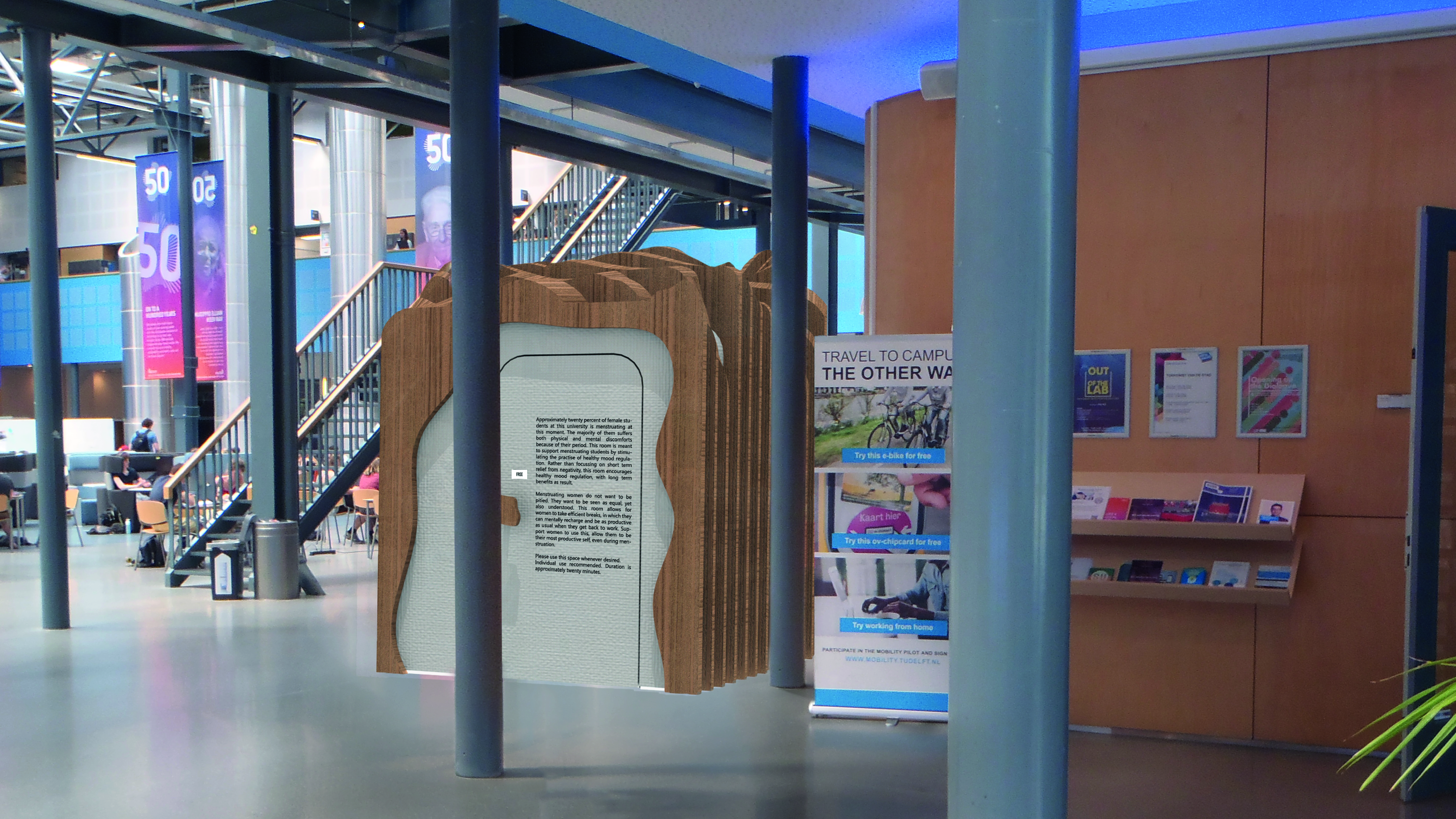 The goal of this report is to study the way in which female university students (aged 18 to 25) deal with their moods during their menstruation, and to use this information to design a product to help them deal with their negative moods in a healthy way, by using resilience-focused mood-regulation strategies. Literature research and the field study conducted in this project show that menstruation is very negatively experienced by women, regardless of how heavy their menstruation is experienced. Their moods are mostly influenced by pain and the inconvenience of bleeding, while the study also showed that the biggest obstacle in daily life is the fluctuating moods caused by hormones. These fluctuations exist in personal patterns, but no literature nor this project’s field study shows universal patterns in mood fluctuations. The most practised mood strategies are rest, withdraw and repress. The study shows that female students do not want to show weakness, they want to work as well as they normally do at university and take painkillers to do so. They ignore all other struggles which tends to exhaust them, resulting in a lack of energy when they arrive home. This is when they finally rest and withdraw, as desired. This project presents the product ‘Mood Booth’ as a solution to these problems. The Mood Booth is a room, centrally placed in every university, for menstruating students to withdraw in. The room is designed for these students to perform a ritual in. This ritual is based on the two resilience-focused mood-regulation strategies most valuable to most menstruating women: embrace (embracing and accepting moods) and detach (distinguish between self and mood and engagement in mindfulness). The design of the Mood Booth’s interior stimulates the practise of these two mood regulation strategies in a twenty-minute ritual, which is guided by light changes. A visit to the Mood Booth should result into a more positive mood, a calmer state of mind and more strength on the long-term to benefit both the academic performance and the quality of personal time during menstruation. The outside of the Mood Booth is a statement, through both location and through the message on the front of the Mood Booth, against the stigma attached to menstruation. The Mood Booth aims to improve moods and does so by stimulating resilience-focused mood-regulation strategies, which answers closely to the design brief. The Mood Booth is also created to answer to the issues found in the research, while also tackling the stigma around menstruation.