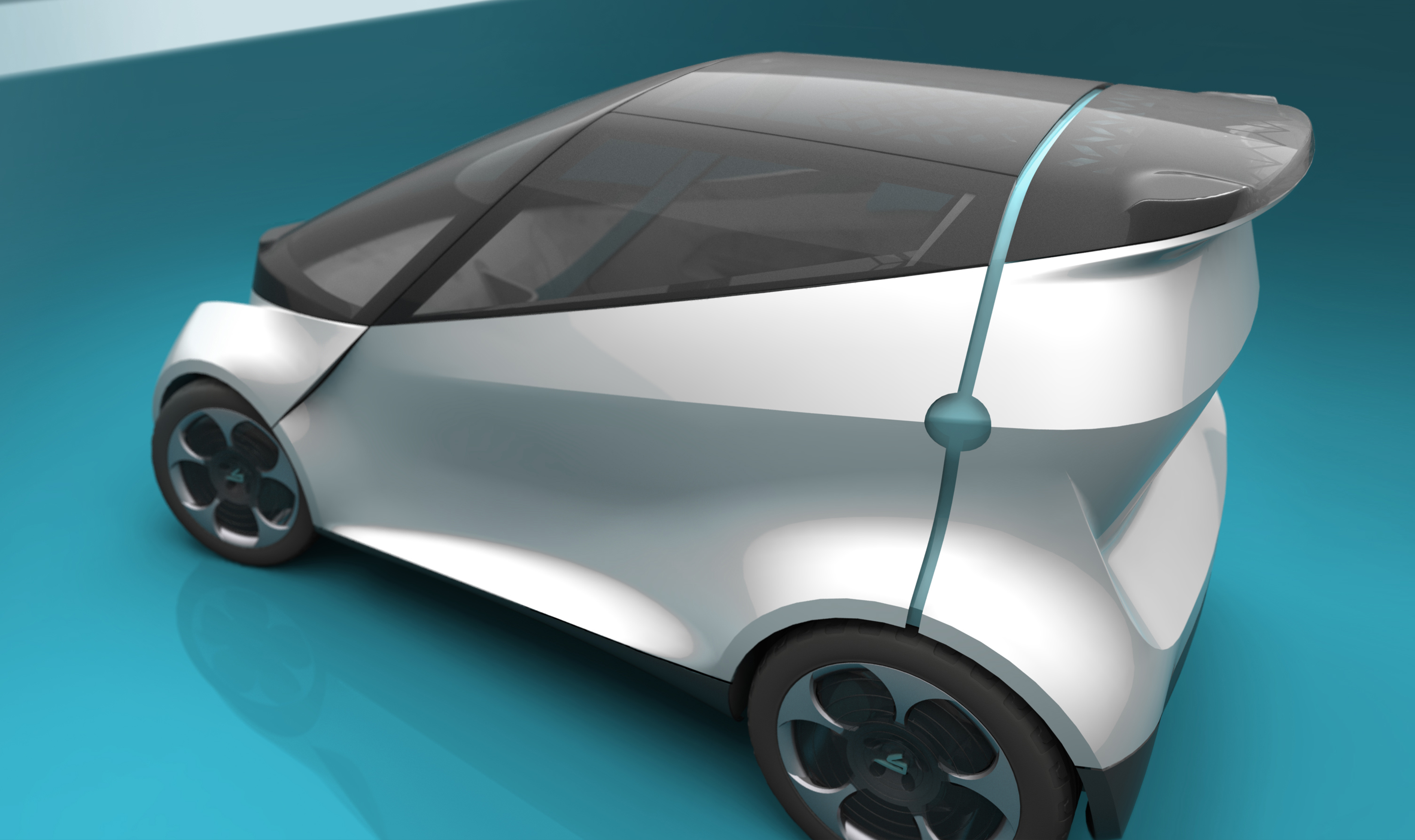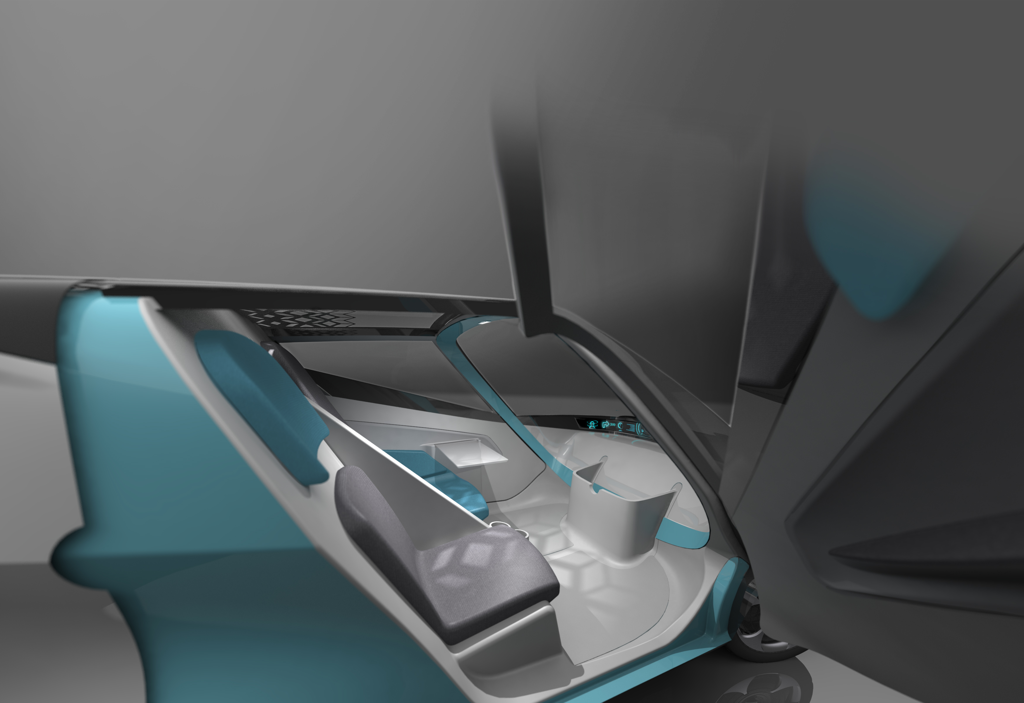 It is expected that the automotive industry will be facing a radical shift, going from human driven cars to cars that are driving autonomously. In this project I started out with performing an in depth literature research to get a good understanding on what is expected to change. My expectations that the design and solutions for a self-driving car can be motivated by other factors than human controlled cars is confirmed by this research. These incentives of autonomous transportation and the implications are used as input for the development of a vision for a shared autonomous car for the city in ten years. Scenarios that show different possible types of vehicle with different function were created and a twoseater urban commuter vehicle was chosen to develop further. The different functions of the interior, such as doing work or relaxing instead of driving, but also the wish to sit facing forward and looking outside and the need for a sense of dependability and trust because you are not in charge of the car's movement are integrated in the final design. Considering the small footprint combined with a desired seating layout and ergonomic seating position, affects the exterior and makes for challenging design boundaries in terms of volume. This project is a collaboration with raw material supplier SABIC and therefore another consideration is how this changing system affects the plastic material business and how SABIC can influence this change in the future automotive development. The car is being used for the daily commute, but during off-peak hours it can be hailed by other users with similar needs (urban travel with one or two persons and some room for storage). The shared character of the car makes that it is going to be used more intensively than a privately owned car and therefore the material requirements are different. I decided upon a car that uses polycarbonate for the greenhouse and different grades of polypropylene compounds for panels and glass fiber reinforced polypropylene for structural parts. Additionally, the car operates in a system where the fleetowner that deploys the cars and brings the car in for service, can repair worn out or damaged parts by replacing them with new components. With plastics this is more convenient than with metal panels and the replaced parts are recycled and brought back into the system as building blocks for newly manufactured parts. The opportunities and challenges of designing with thermoplastics are identified and accounted for in both the design of the interior and the exterior. Places where different parts meet in the exterior design are showing deliberate transitions, masking the thermal expansion of the plastic components and hiding misalignments when parts are replaced over time. Also the potential of the integration of visual sensors needed for autonomous handling in polycarbonate greenhouse parts is highlighted. In the interior the working and relaxing functions are implemented by showing a clear division between the working side and relaxing side of the car.