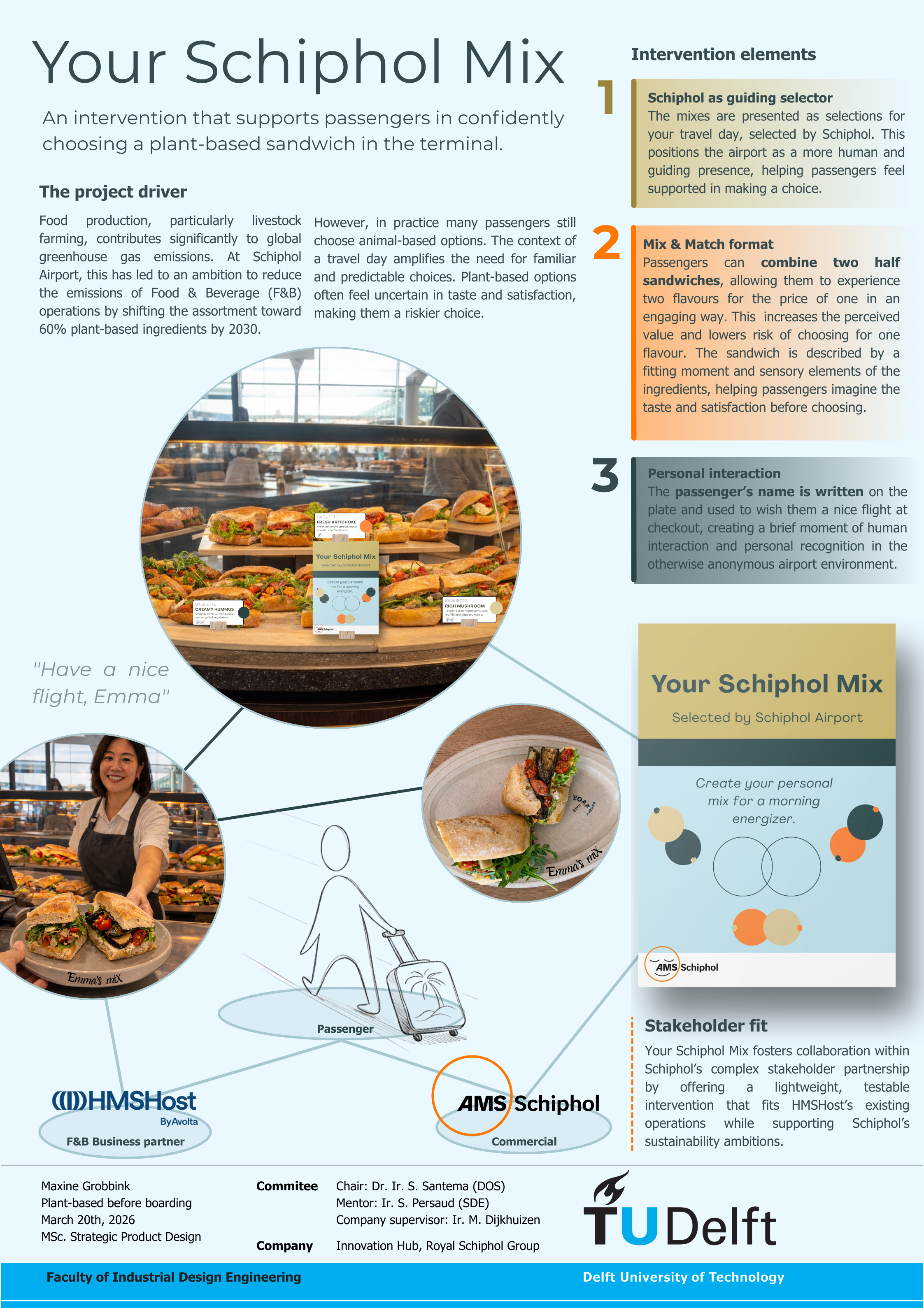 The intervention combines three elements. First, Schiphol acts as a guiding selector, presenting a curated set of sandwiches as reliable travel-day options without emphasizing their plant-based nature. Second, a Mix & Match format allows passengers to combine two half sandwiches at no extra cost, lowering perceived risk and enabling imagination of taste. Third, a personalized hospitality interaction, where the employee writes the passenger’s name on the plate and wishes them a good flight, adds a meaningful human gesture to an otherwise anonymous environment (ACI, 2025).