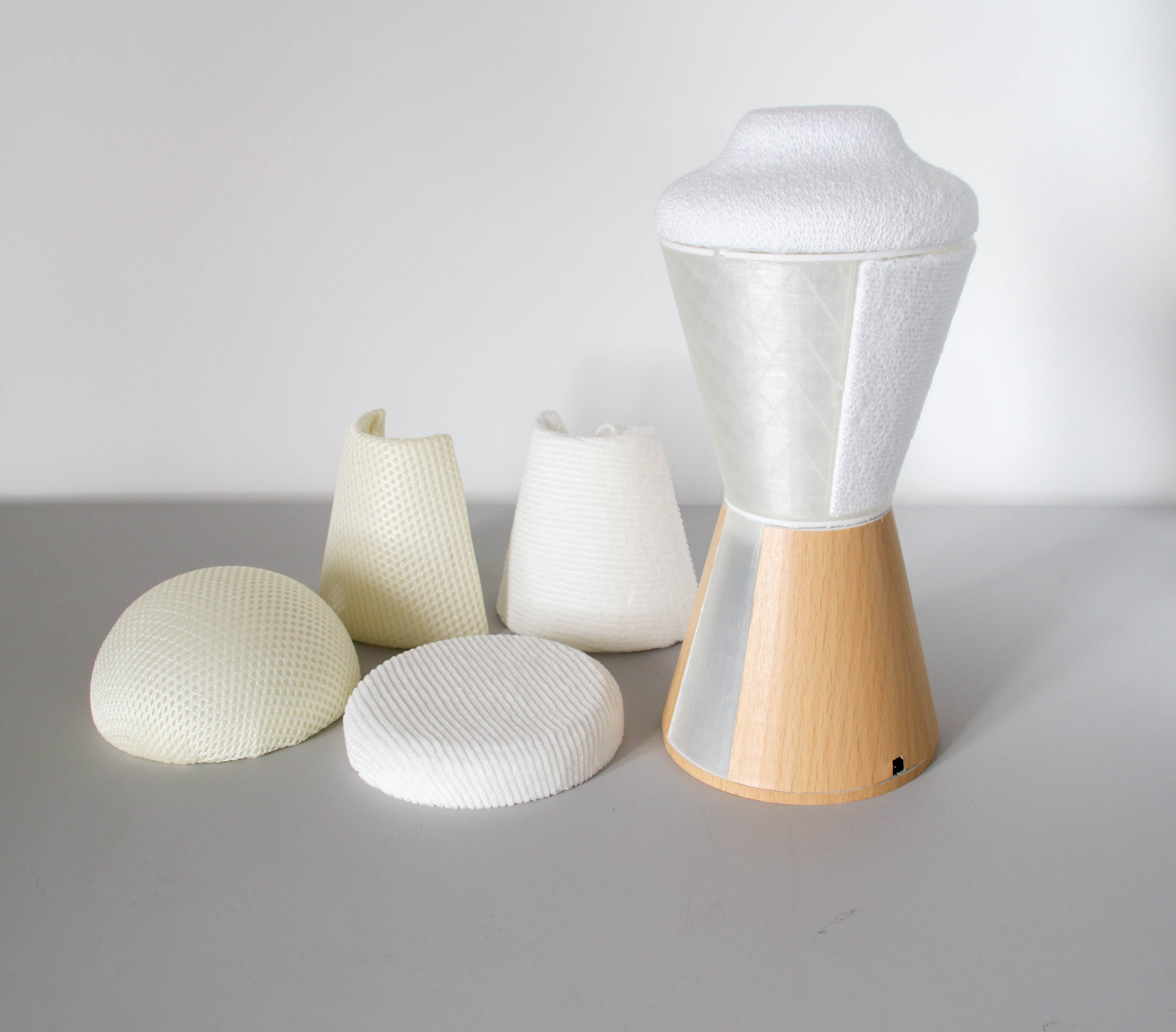 Most current textile housings are fabricated by gluing or welding the textiles to the outer surface and inner edges of the part. This method obstructs easy disassembly. An alternative method was created. This “clamping” fastening method is considered more sustainable because it allows the housing to be disassembled with ease and therefor repaired or recycled more efficiently. A clear use cue was added to the inside of the clamping mechanism to inform the user about its disassembly potential.