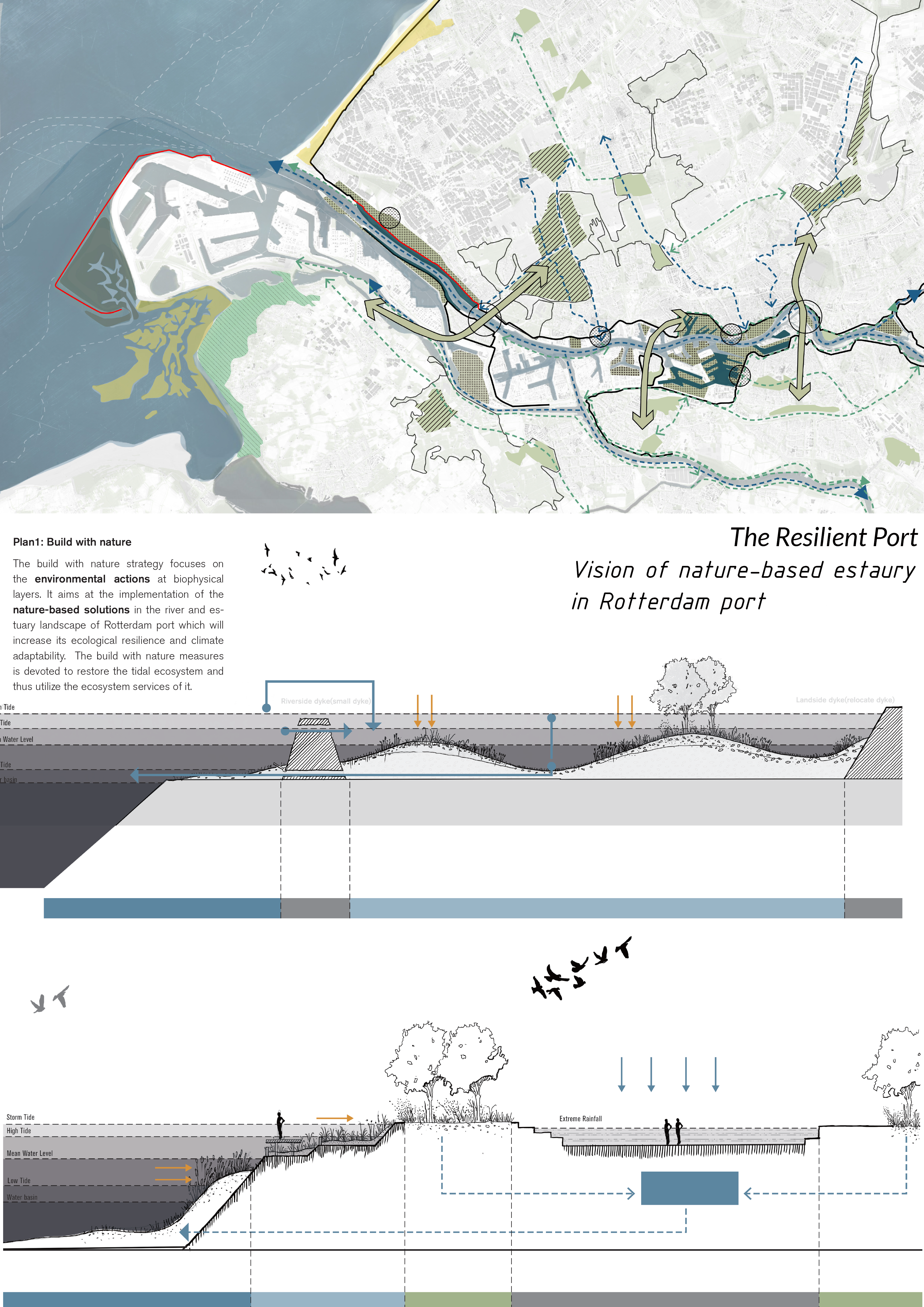 The project envisioned a social-ecological resilient waterfront for Rotterdam. By focusing on the outer dike area of Rotterdam, it aims to protect the port from flooding ,and at the same time create more nature habitat for biodiversity. With creating a resilient river, it can re-realize the role of industry and reconnect them into resource flows, in the end, it will formulate a healthy and liveable social-ecosystem at New River Mass. The vision of the River Mass is firstly to restore the riverfront as the place of ecological importance and also aplace for working, living and recreations. It should be a place for people to come and meet together. In order to achieve that, it implies four strategies including protect, restore, reconnect and grow. Stadhaven is the programmes for applying proposed strategies. In fact, the stadhaven is an area in transition. Over the coming decades, new links between the city and port will be constructed in stadhaven to bridge the port and city, at the same time, develop the economy. It is vulnerable to high water levels since it is part of old harbour complex. The area is on the water which is subject to tidal dynamics and could have transition between River Mass and inner city distcit. Based on that, the systematic strategies could start from the aspects of Nature(sedmiation), densification and open space and access.